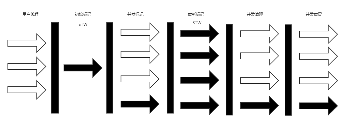 CMS把回收过程从一个步骤拆分为多个步骤,把标记和清理都进行了拆分,把最耗时的标记对象步骤进行与用户线程并发进行,从而让应用程序几乎感知不到STW的停顿时间,唯独只有初始标记时与重新标记时有很少的STW停顿时间,其他流程都是并发进行。所以CMS达到了最短回收停顿时间目标,最短回收停顿时间不代表整个回收流程时间要小于其他垃圾收集器,其实CMS整体回收时间是要大与其他垃圾回收器的,但是CMS的停顿时间是最小的。