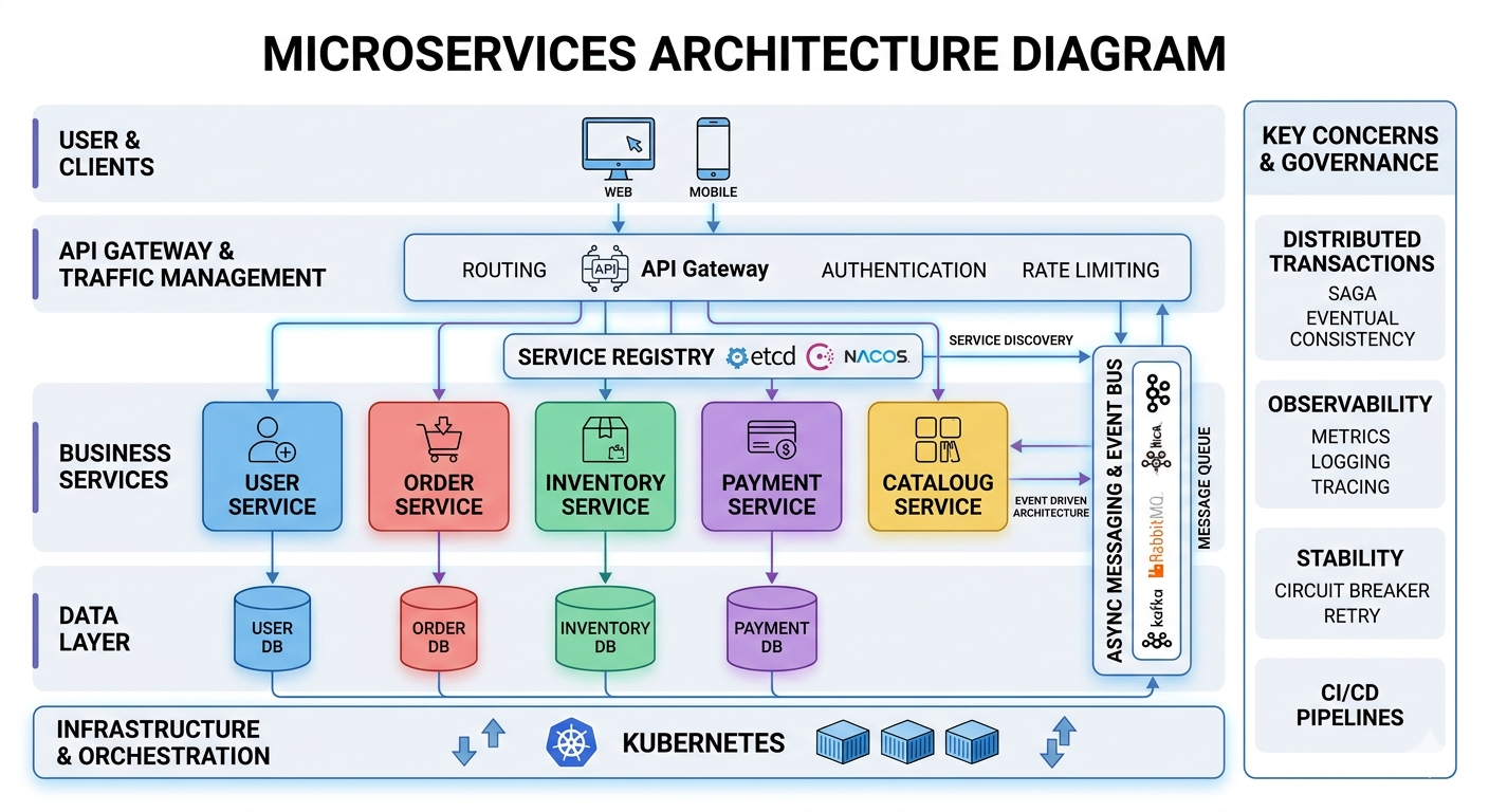 但微服务并不是简单的技术升级,它需要配套的基础设施,例如服务注册中心、API 网关、消息系统、监控系统以及容器平台等。只有在完整技术体系支持下,微服务架构才能真正发挥价值。